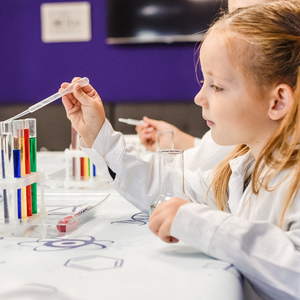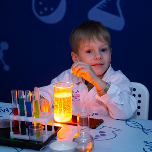 Научный халат и рабочее место с настоящей лабораторной посудой для каждого участника мастер-класса.